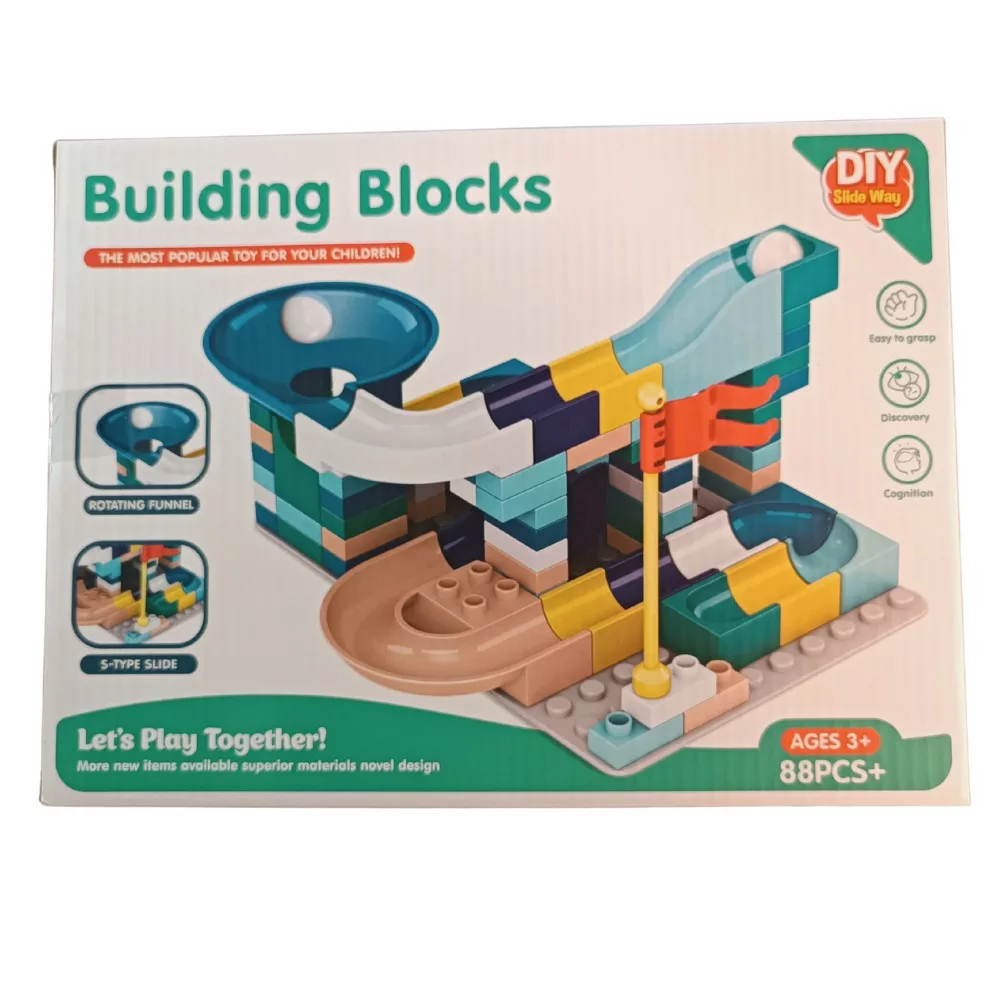Játszon kedvére egy autós parkolóházban a gyerekkel. A 88 db építő elembőlből egy parkolóház építhető.
