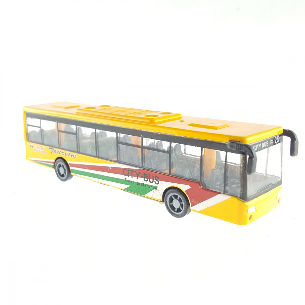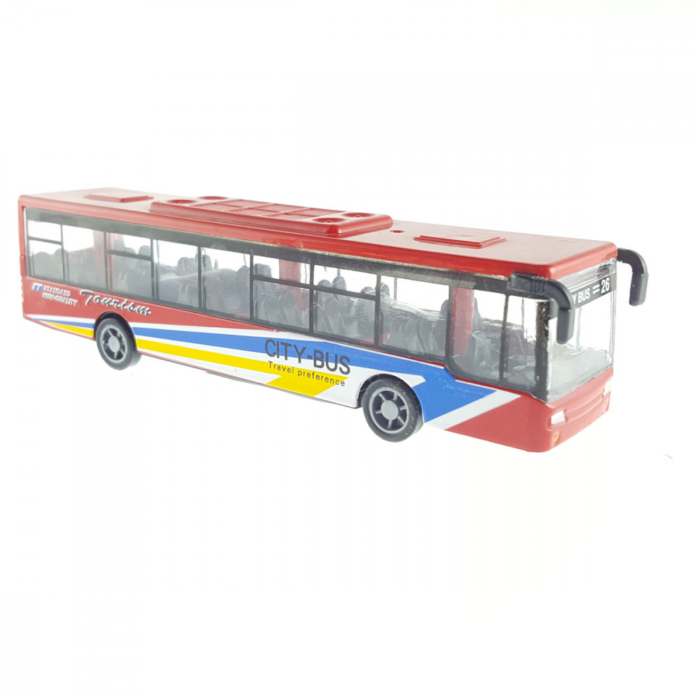 A busz fémből és műanyagból, hátrahúzós kivitelben készült játék.