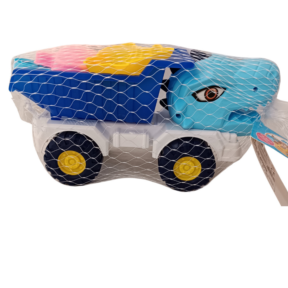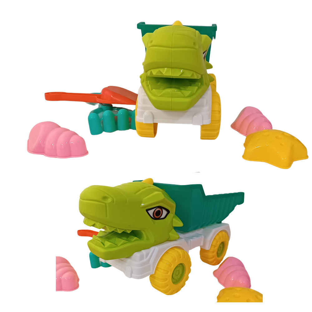 Homokozó készlet dínós autóval. A készlet 1 autót, lapátot, gereblyét és 3 formát tartalmaz.
