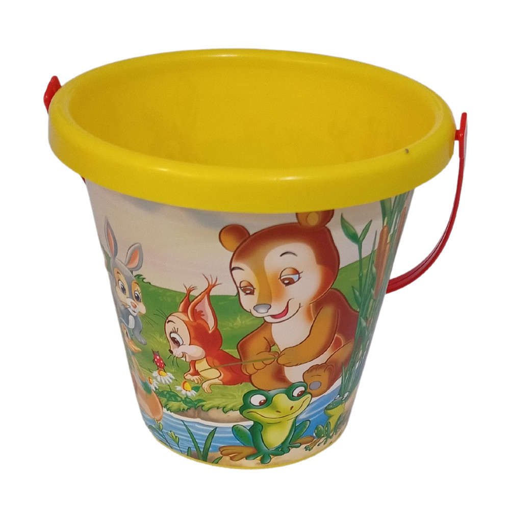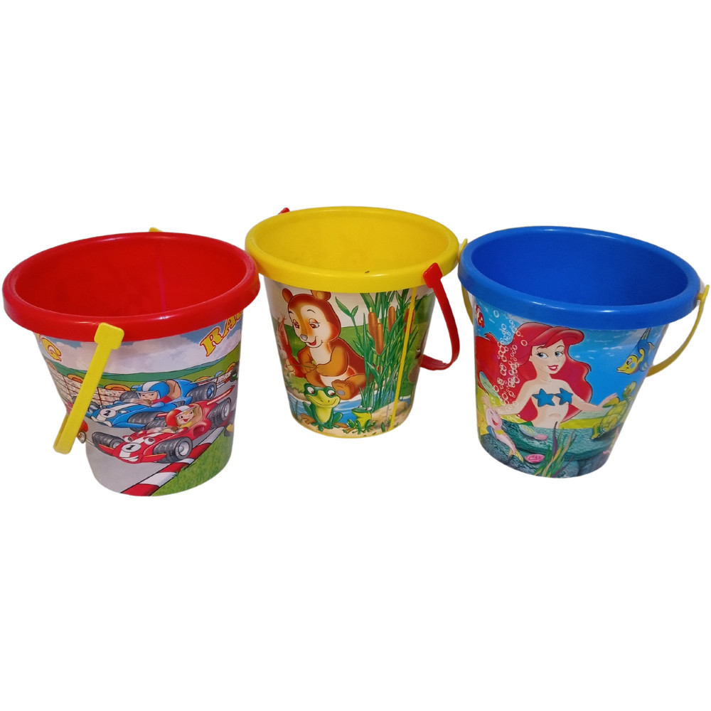 Homokozó vödör mesefigurákkal, kis méretű.