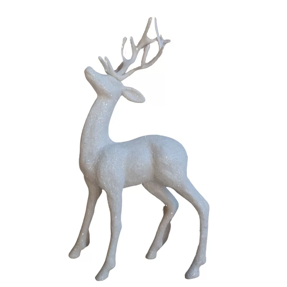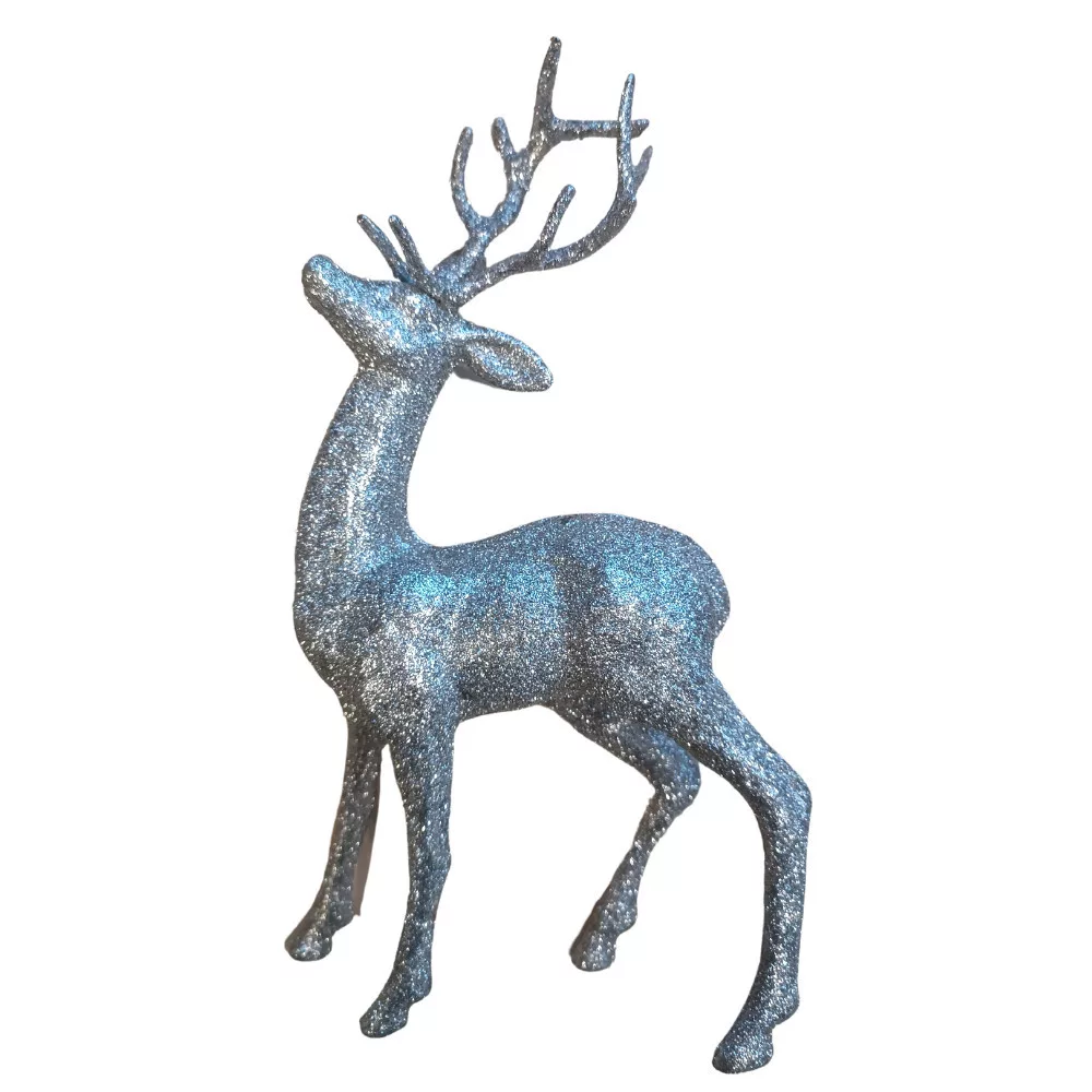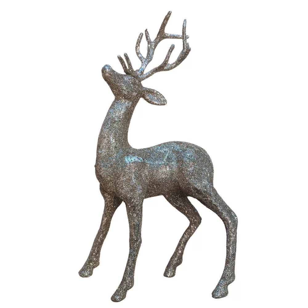 Karácsonyi dekorációhoz remekül használható poly rénszarvas csillogó színben. Mérete: 27 cm.