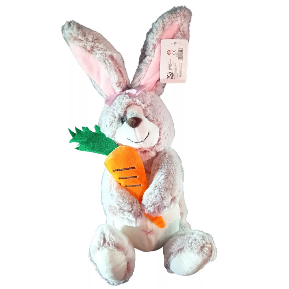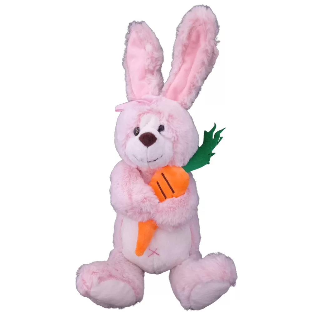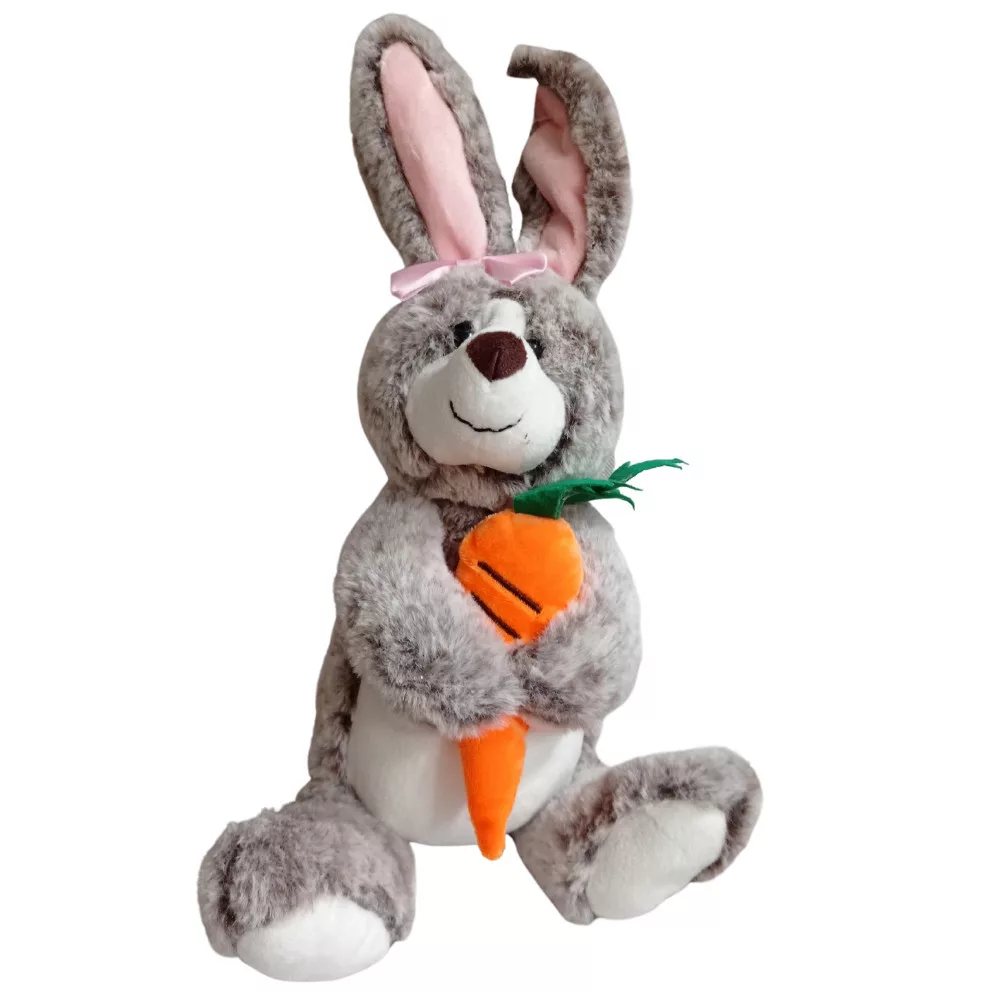 Nyuszi répával, rózsaszín világos barna és szürke színekben. Teljes magasság: 45 cm; répa 22 cm