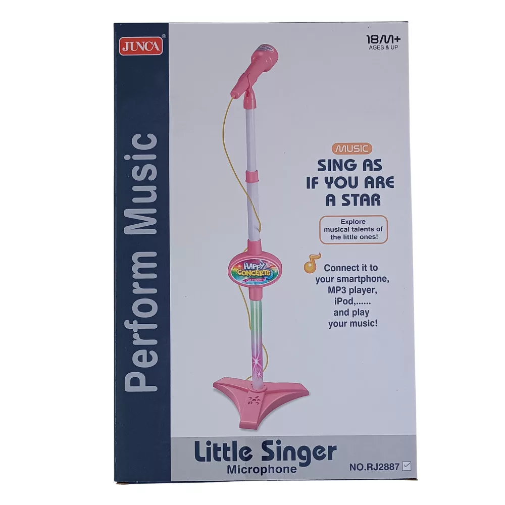Karaoke mikrofon , állítható magasságú állvánnyal és beépített hangszóróval . Külső hangforrás ( Mobiltelefon , laptop , Ipad , stb. ) is csatlakoztatható jack kábellel , így akár a kedvenc zenéire is tud a gyermek karaokézni . 3 év felettieknek